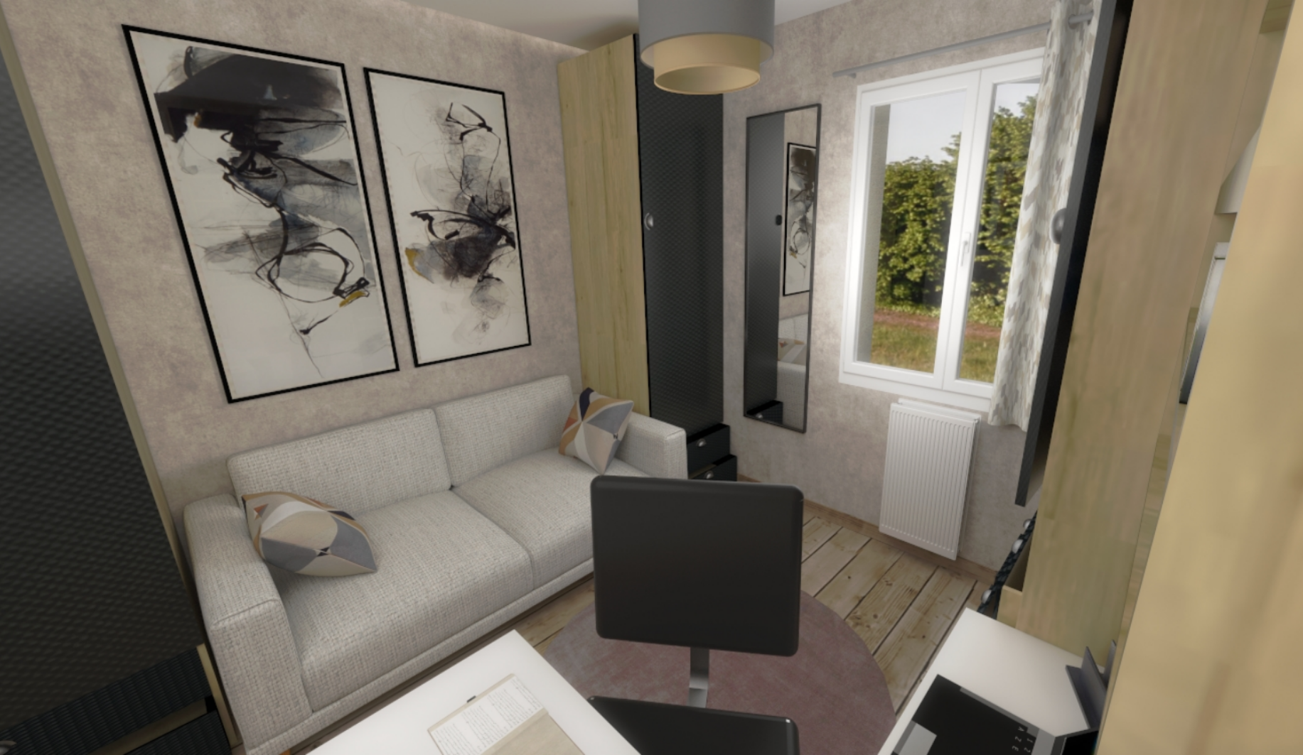 Revoir l’agencement d’une chambre d’amis / bureau afin de la désencombrer, de montrer sa surface et son exploitation possible.