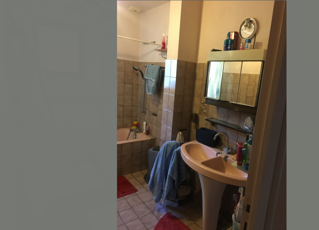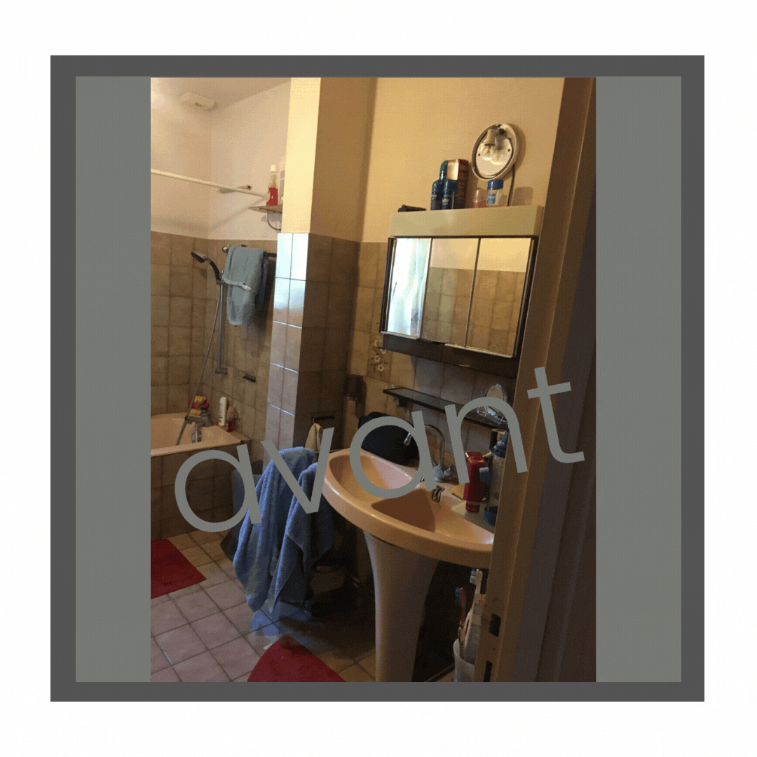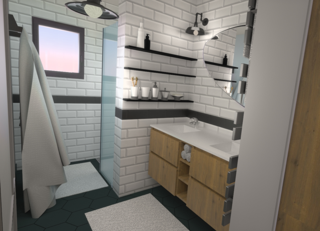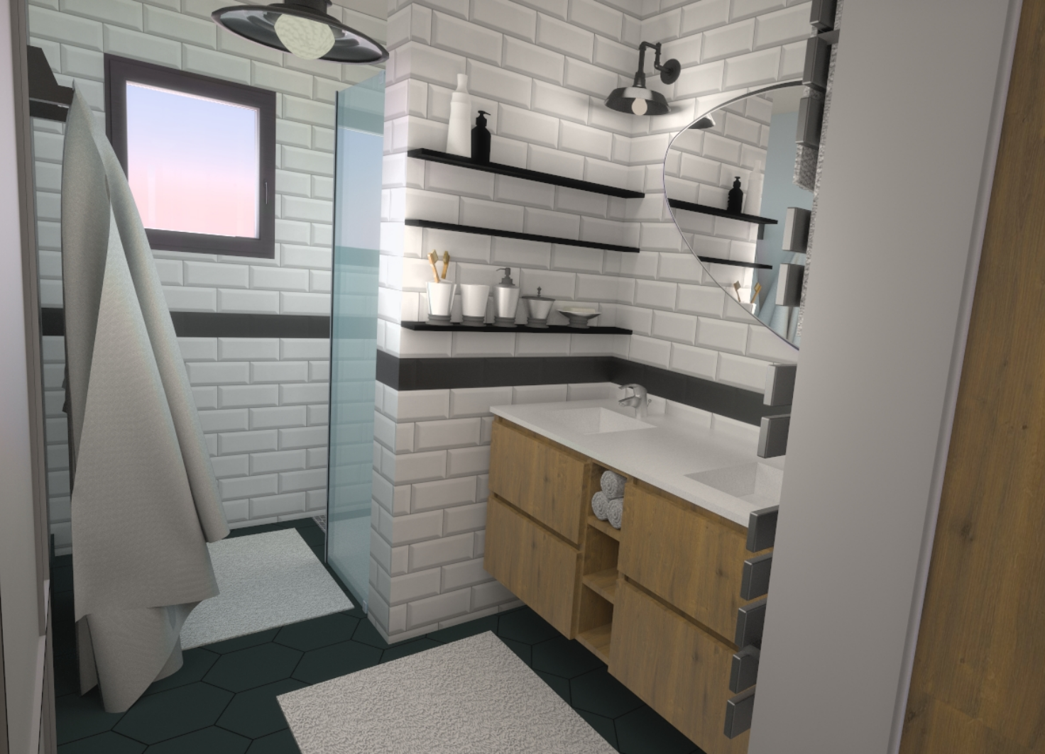 Transformation d’une salle de bains vieillissante des années 70 avec un meuble double vasque et une douche à l’italienne.